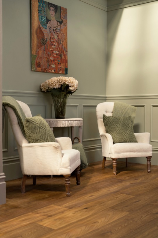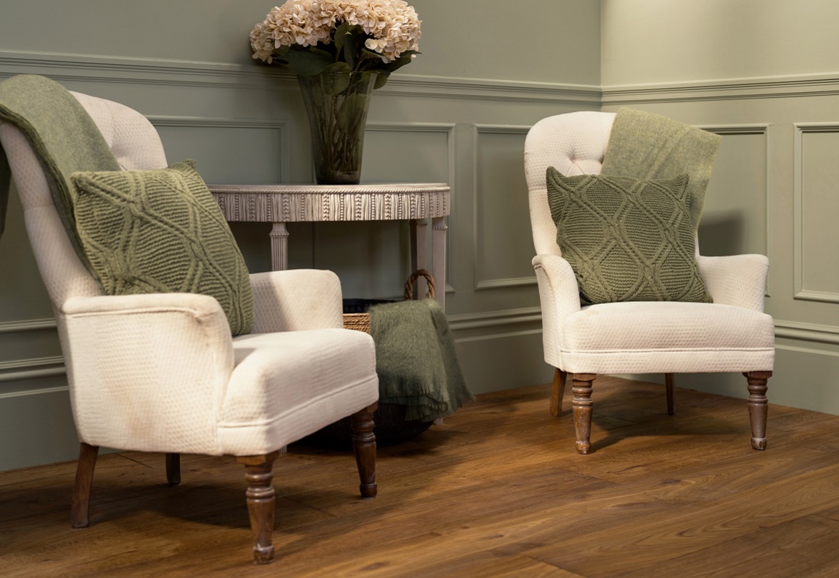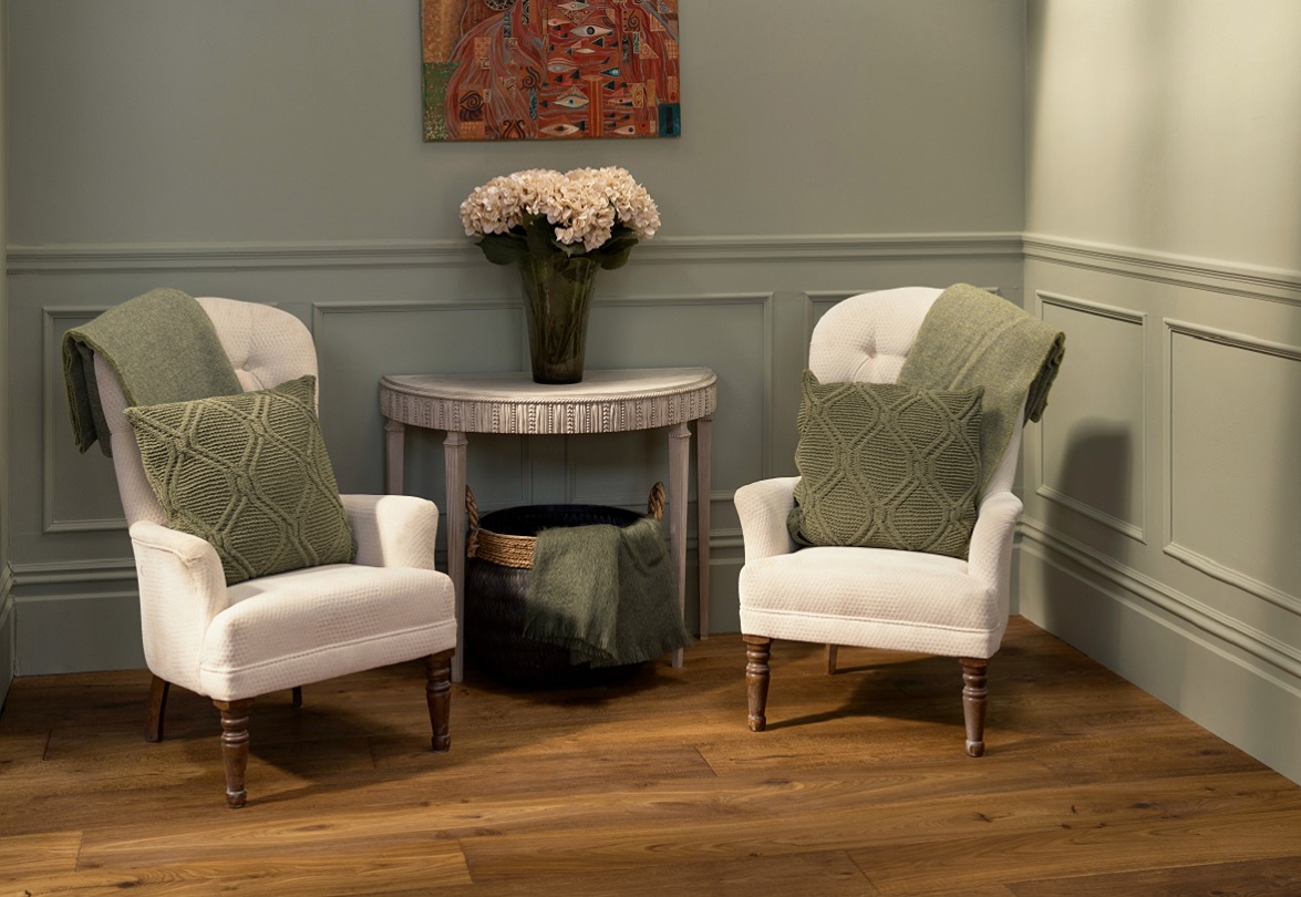 If your scheme demands an oak floor of elegance, luxury, polish & grace then our Stanford oak flooring has to be at the top of your shopping list. This artisan worked oak is first selected to have all the characteristics of an aged hardwood floor like shrunken knots & small cleaves. It is then deep smoked, a process that fumes the raw oak for a longer period, darkening the colour. Due to the different moisture content within the boards, this procedure results in a highly attractive tonally varied oak floor awash with colours ranging from pale golden umber to mild latte. Each plank is then manually scraped, antiqued, brushed and polished using a series of techniques to transform the ‘clean’ oak into a true facsimile of a well-trodden, time-loved, historic wooden floor.
